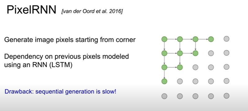 ● PixelRNN 과 PixcelCNN 은 다루기 쉬운 밀도 함수(tractable density function)인 likelihood p(x) 를 명시적으로 계산해내고, training data 의 likelihood 를 최대화하여 최적화시킨다. good sample 을 만들어 낼 수 있으나 순차적인 생성으로 느리다는 단점이 존재한다.