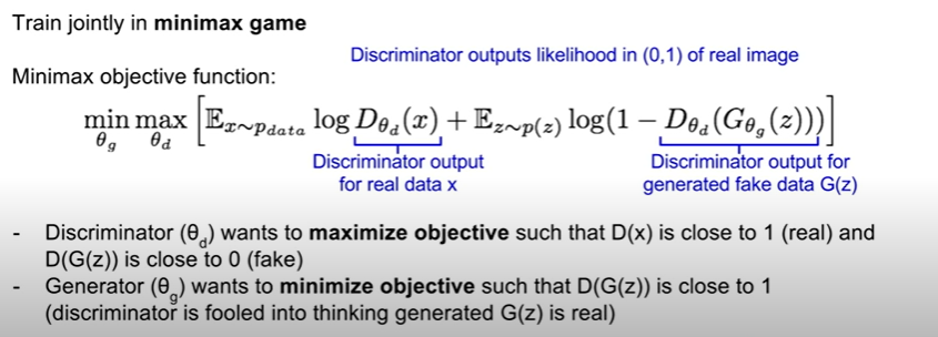 discriminator 는 objective function 을 최대화시키기 위해 D(x)을 1에 가깝게, G(z)는 0에 가깝게 해야 한다 (D 의 파라미터인 세타 d 를 최대화시키고, G 의 파라미터인 세타 g를 최소화시키는 게 목표). 이런 원리로 실제 데이터와 가짜 데이터를 분류한다.